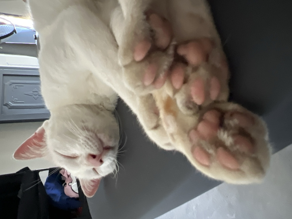 - "The scene, located in Cam Đức, Vietnam, depicts a white domestic cat sleeping on a dark gray, flat surface" by FM-gZMgt2, licensed under CC BY 4.0