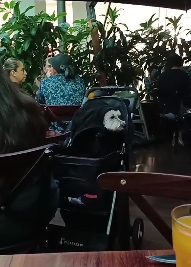 The scene shows a small white dog sitting in a black stroller at a restaurant or cafe