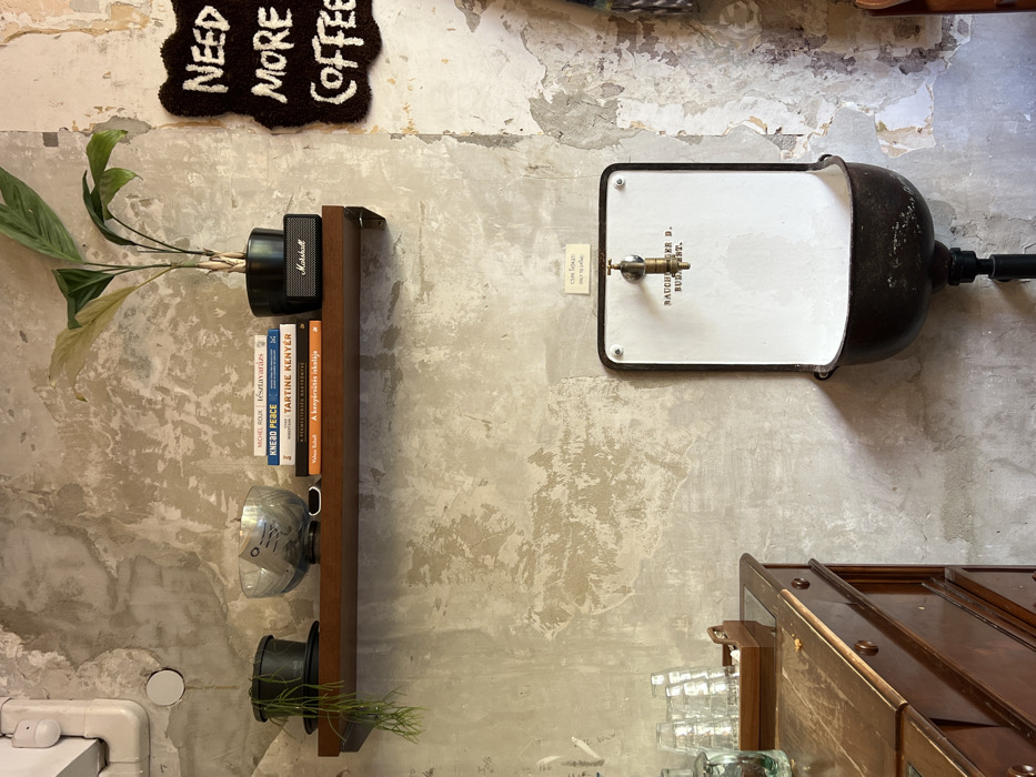 The scene captures a rustic interior wall of a cafe or similar establishment in Budapest, Hungary. The background features a distressed, light grey concrete or plaster wall with visible peeling and textured imperfections. A wooden shelf is mounted horizontally across the upper middle portion of the wall. On the far left of the shelf, a small dark potted plant with trailing green foliage sits. To its right, a clear glass bowl contains various items, possibly papers. Centered on the shelf is a stack of five books, with visible titles including "MICHEL ROUX TÉSZTAVARÁZS," "KNEAD PEACE," and "TARTINE KENYÉR," with some titles indicating Hungarian language. To the right of the books, a larger dark potted plant with broad green leaves is positioned next to a black Marshall-branded Bluetooth speaker. In the upper right quadrant, a dark brown, possibly felt or tufted, wall decoration shaped like a speech bubble displays the words "NEED MORE COFFEE" in white lettering. Below the shelf, positioned centrally on the wall, is an antique-style wall-mounted basin. It consists of a white enameled rectangular panel with a brass-colored spigot protruding from its center. Below the spigot, the panel is embossed with "BAUCHER D. BUDAPEST." Beneath the enameled panel, a deep, dark, and visibly aged metal bowl-shaped basin is attached, with a black drainpipe extending downwards. Directly above this basin, a small rectangular sign is affixed to the wall, reading "CSAK SZIKES" above a smaller "ONLY TO OPEN," indicating a sparkling water dispenser. In the lower left foreground, a section of a dark wooden cabinet or dresser with visible drawers and a glass top surface is present. On its surface, several clear drinking glasses are stacked upside down in groups next to a small wooden tray. A light green glass bottle is also visible on the cabinet top. No individuals are present in the image.