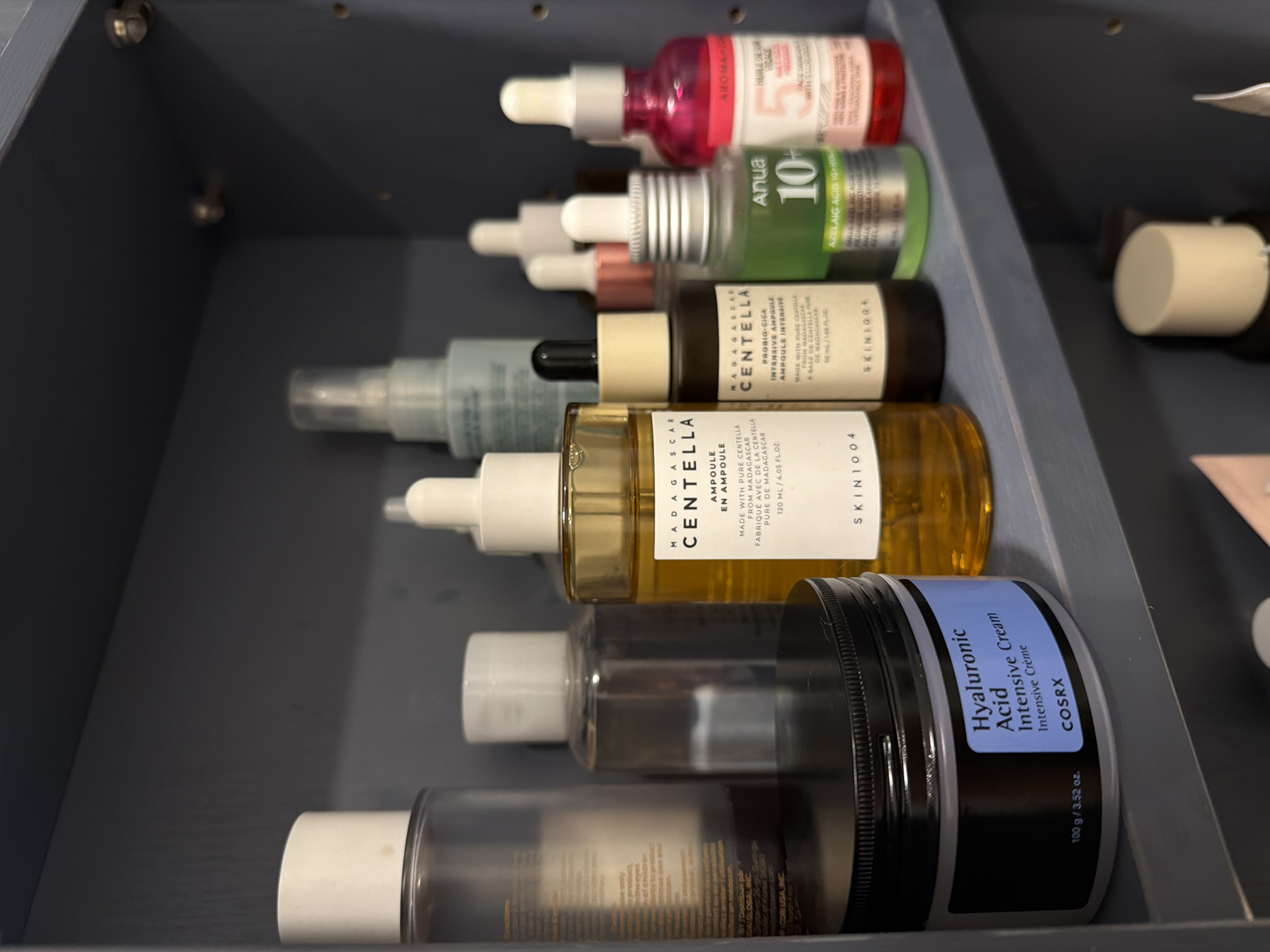 This is a close-up shot of a drawer, likely in a bathroom or vanity, packed with various skincare products. Brands visible include SKIN1004 (Madagascar Centella Ampoule and Probio-Cica Intensive Ampoule), Anua, and COSRX (Hyaluronic Acid Intensive Cream). The products are arranged horizontally, filling most of the visible space. The drawer itself is made of a blueish-gray material. I cannot comment on the location of this drawer without being given more information.