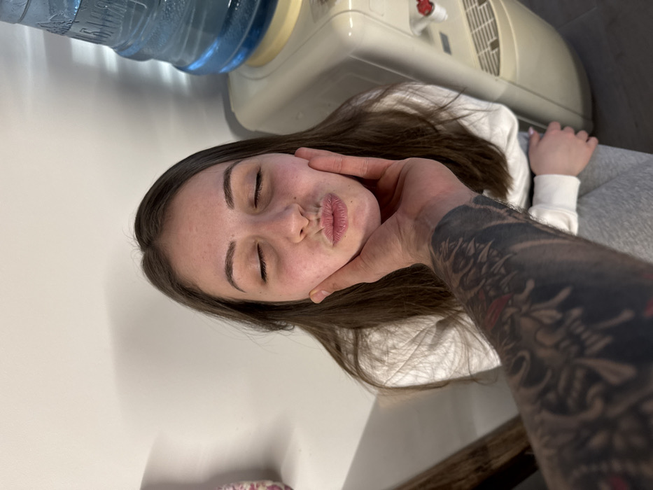 In the city of Bulgarovo, Bulgaria, a female individual with long brown hair, closed eyes, and pursed lips is observed from the chest up. She wears a white long-sleeved top and grey pants. Her face is cupped by the right hand of a second, unseen individual. This hand and the visible portion of the forearm are extensively covered with dark, intricate tattoos. To the female's right, a beige water cooler with a large blue water bottle on top is present, positioned against a light-colored wall. A dark floor surface is visible in the lower right foreground, and a dark, possibly wooden, object is partially visible on the far left.