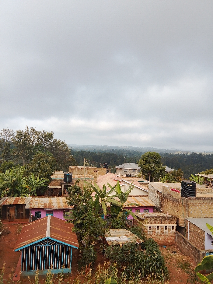 An elevated view shows a densely populated area with simple dwellings nestled amongst lush vegetation. The homes, constructed with a mix of materials including brick, corrugated metal, and wood, display varied colors. The sky is overcast, casting a soft, diffused light over the scene. In the distance, a rolling landscape covered in dense forest creates a sense of depth and scale. A blue and brown shack sits in the foreground.
