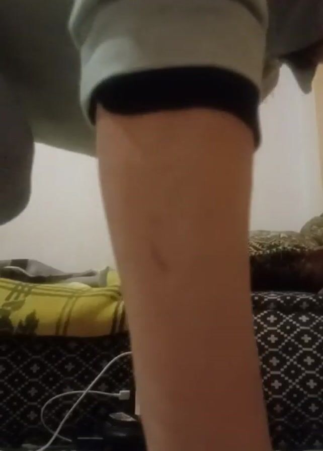 A close-up video shows a person's right forearm extended downward, with the hand resting on a white surface