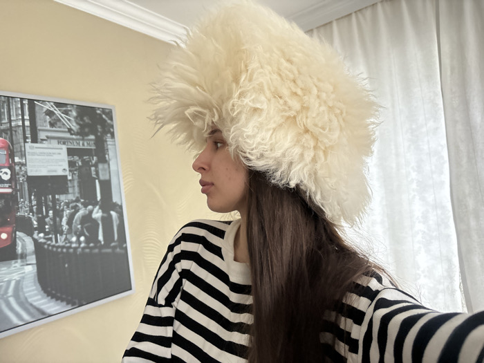 A mid-shot selfie captures a young individual, likely female, situated indoors in Slavyansk-na-Kubani, Russia. The individual is presented in right profile, gazing towards the left, with long dark brown hair visible. They are wearing a prominent, voluminous, light cream-colored fur hat, consistent with a papakha style, and a long-sleeved shirt with horizontal black and white stripes. The individual's lips are slightly parted. The background on the left features a framed black and white photograph mounted on a light beige wall. This photograph depicts a busy urban street scene, including a partial red double-decker bus on the left, numerous pedestrians, and a cylindrical street barrier system. A sign within the photograph is partially legible as "FORTNUM & MAS". To the right of the individual, a white, sheer curtain covers a window. A white ceiling with decorative molding is visible at the top of the frame.