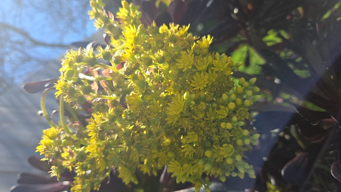 - "A close-up photograph taken in Lompoc, United States, depicts a prominent cluster of numerous small, bright yellow, star-shaped flowers and buds belonging to a succulent plant, likely an *Aeonium* species" by FM-0J88a2, licensed under CC BY 4.0