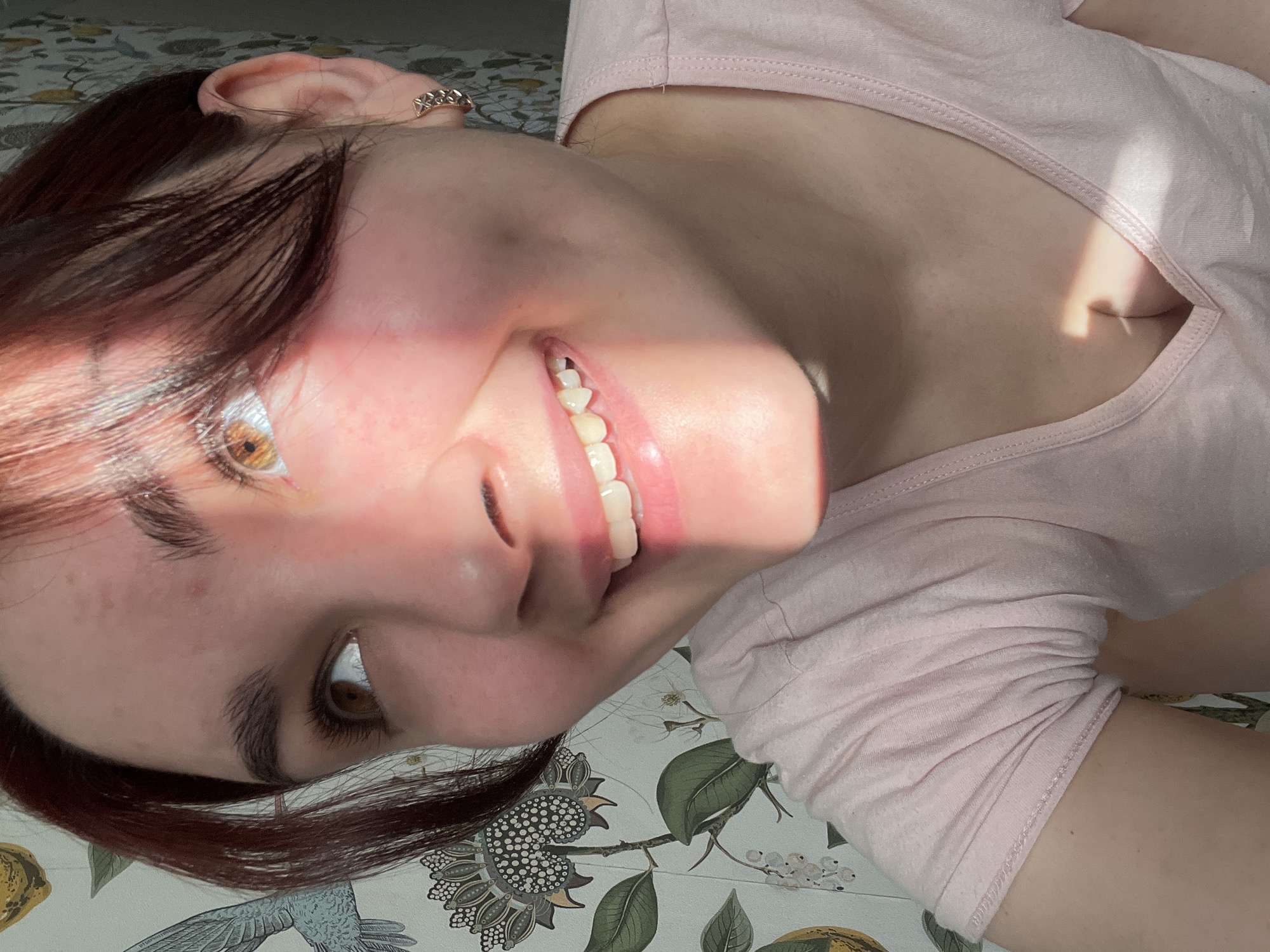 A woman with fair skin and reddish-brown hair is angled towards the camera, with a broad smile revealing her teeth. She wears a light pink t-shirt with a scoop neck. Her eyes are hazel. She has an earring in her left ear. The background features a floral pattern with lemons, birds, and flowers in muted colors. The location is not discernible from the provided information.