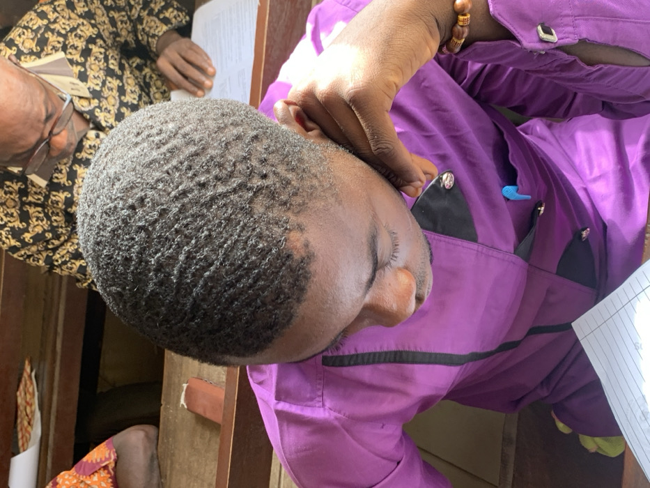 The image depicts an indoor scene in Abobo, Nigeria, with three individuals