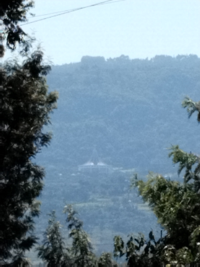The image displays a panoramic landscape captured from an elevated viewpoint in Subukia ward, Kenya, showing the National Shrine of Mary Help of Christians situated within a valley. The foreground features dark, dense tree foliage partially framing the scene from the left and right sides. The midground reveals a lush, green valley containing scattered vegetation and a prominent white building characterized by two distinct, light-colored conical or spired roofs. This structure, identifiable as the Subukia Shrine, is surrounded by green terrain. The background consists of hazy, densely forested hills or mountains under a clear, light blue sky. A thin, dark linear object, possibly a utility wire, traverses the upper portion of the sky. No individuals or specific actions are discernible.