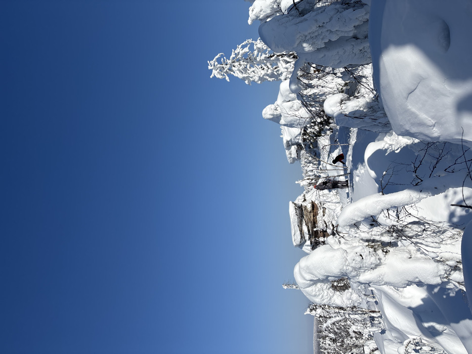 The image displays a panoramic winter landscape in Shumikhinskii, Russia, under a clear, bright blue sky. The entire visible terrain is covered in thick, white snow. In the midground, two individuals and a dark-colored dog are present. One person, clad in grey and white camouflage-patterned winter clothing, stands upright, holding a dark pole-like object vertically. To their right and slightly lower, a second person wearing a red or orange jacket kneels or crouches on the snow, appearing to interact with the dog. The immediate environment includes several large, irregularly shaped rock formations and numerous trees, all heavily encrusted with snow and rime ice. A dense, snow-covered forest line spans the distant horizon.