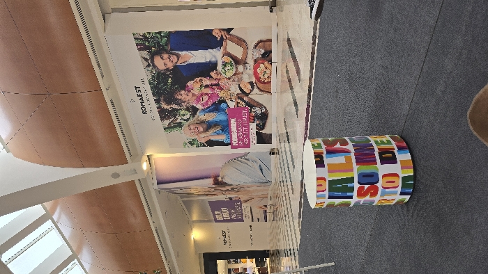 The image depicts an interior view within the RomaEst shopping center, located in Rome, Italy. The perspective is low, looking into a wide, open mall concourse. In the foreground, centered on a dark grey carpeted floor, is a cylindrical object, possibly a bin or display, adorned with vertical blocks of multi-colored text that reads "BEAUTY IS SOMETHING TO DIE FOR". The carpet transitions into a lighter tiled floor with geometric patterns further into the midground. The midground and background are dominated by large promotional banners covering the walls. The most prominent banner on the right features three smiling individuals—two women and one man—seated around a table with various food items, including salads and sandwiches. Text overlaid on this banner includes "ROMAEST" and "FORUM-ROMA". To the left, a partial banner shows the back of a person. The ceiling features a series of skylights and large, curved panels with a reddish-brown finish, supported by white structural beams where light fixtures and speakers are mounted. No actual people are present on the mall floor; all individuals depicted are part of the large advertising displays.