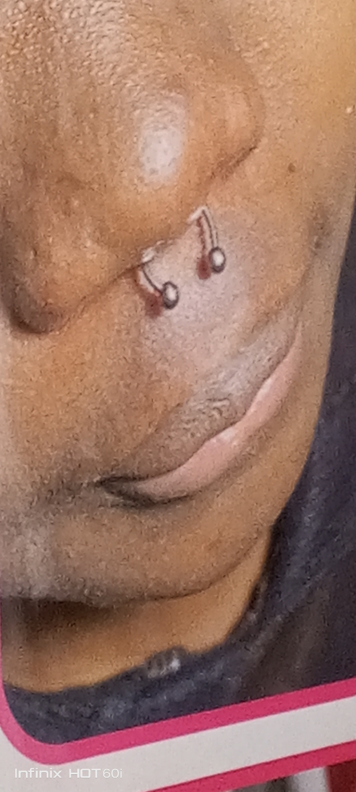 A close-up photograph depicts the lower facial region of an individual with medium-to-dark brown skin tone, specifically focusing on the nose and mouth