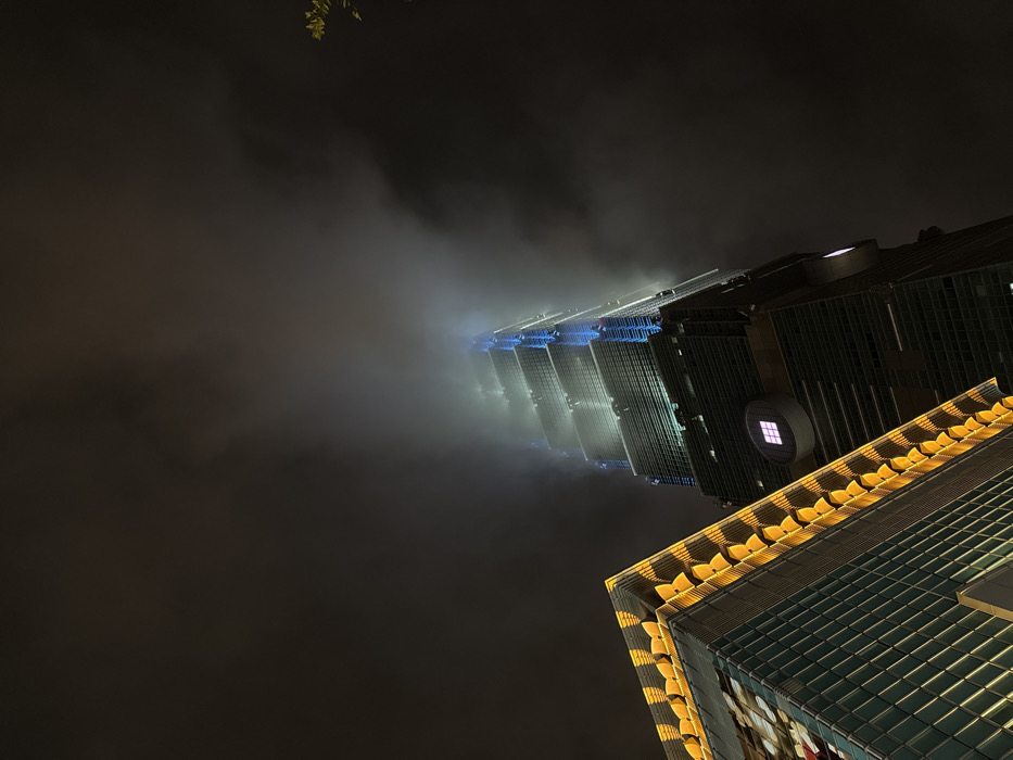 This nighttime image depicts a low-angle view of the Taipei 101 skyscraper in Taipei, Taiwan. The skyscraper's dark, multi-tiered facade is illuminated with cool white and blue lights on its upper levels, with a significant portion of its peak enveloped and diffused by dense fog or low-lying clouds, creating a luminous glow. Distinctive circular architectural elements with square openings are visible on its structure. In the lower-left foreground, a section of another building is visible, characterized by a geometric design and brightly illuminated edges with warm yellow-orange lights forming a patterned, scalloped motif. The sky is dark and overcast. No individuals or specific actions are discernible within the frame.