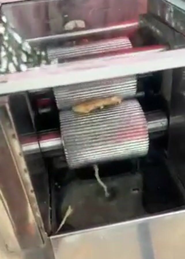 Here is a detailed description of the video. The video shows a sugarcane juice vendor using a machine to extract juice from sugarcane. The machine consists of three cylindrical, horizontally oriented rollers. The vendor feeds pieces of sugarcane into the machine, where the rollers squeeze the juice out of the cane. The juice flows into a collection container below. The vendor is wearing a pink long sleeve shirt, a striped skirt and a light colored scarf. The machine is made of stainless steel.