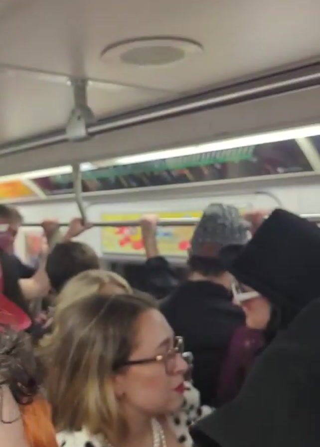 The camera records the interior of a crowded subway car. Overhead lights illuminate the silver roof of the car, and a horizontal panel near the roof displays route information. The carriage is filled with diverse people, some holding onto overhead handrails. A woman in the foreground, wearing glasses and a pearl necklace, appears to be engaged in conversation with someone out of view. Next to her, a person in a top hat and sunglasses is visible. A poster is visible on the wall, and the overall atmosphere suggests a typical, busy subway ride.