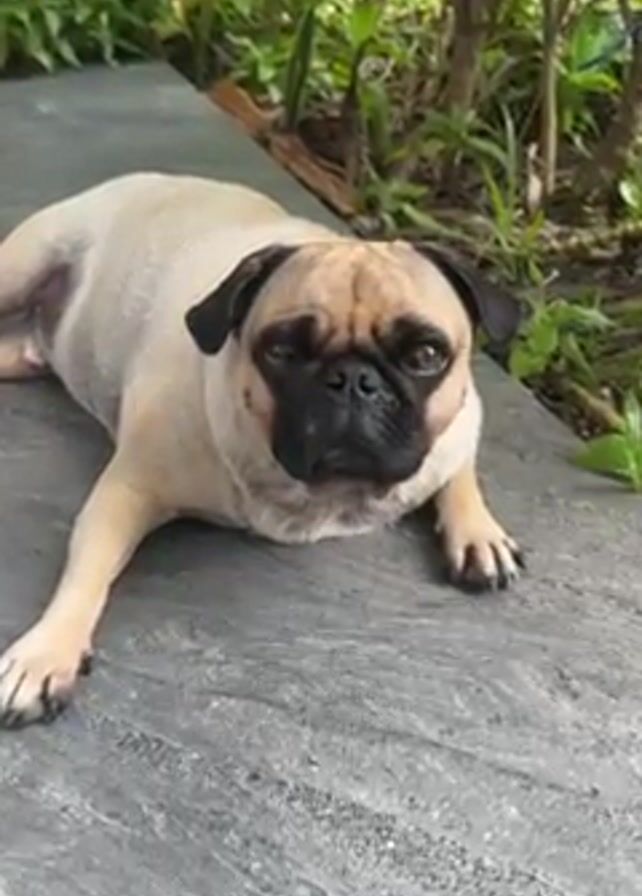 A pug lies on a gray stone surface outdoors. The pug has a tan coat with a black face and ears. It is lying down, with its legs extended in front of it. The dog looks at the camera. In the background, there are green plants and trees.