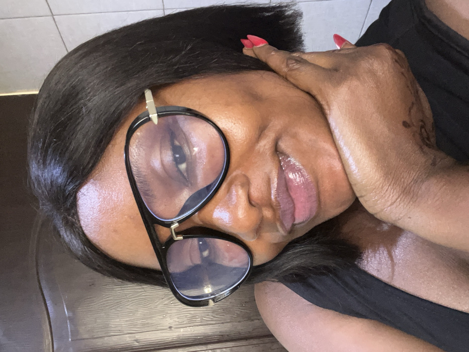 A close-up image depicts a single adult female of dark complexion, positioned in an indoor setting within the city of Dzhidu, Nigeria. The exact location within Dzhidu is not discernible from the image. The subject has short, dark hair styled in a bob and wears large, black-framed aviator-style glasses with clear lenses and gold-toned accents. Her lips are glossy and slightly parted in a faint smile. She is wearing a black sleeveless garment. Her right hand is raised, with the palm facing inwards, resting beneath her chin and jawline. The fingernails on her right hand are painted with red polish. A faint dark, intricate marking or design is visible on the dorsal surface of her right hand and wrist. The background on the left features a dark, possibly wooden, vertical surface, while the right background shows light-colored square tiles. Lighting appears to be even, illuminating the subject's face directly.