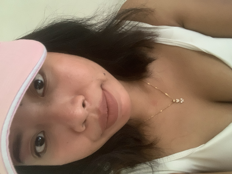 A woman with dark hair and skin, wearing a pink sleep mask pushed above her forehead, reclines. She has a slight smile, full lips, and a mole near her eye. She wears a white tank top and a delicate gold necklace with floral pendants. The camera angle is slightly above and to the side, capturing a close-up view of her face and upper chest.