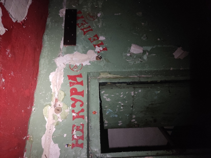 The image displays a dimly lit, decaying interior space within an unknown structure in the city of Unknown, Unknown. The upper wall is painted a faded, peeling green, with significant sections of paint chipped away, exposing a lighter substrate underneath. A prominent horizontal strip of white plaster or base material is visible along the upper portion of the green wall. The ceiling is painted a contrasting, peeling red. On the left side of the frame, a partially open doorway reveals a darker passage beyond. Above this doorway, large red Cyrillic characters spell "НЕ КУРИ" (DO NOT SMOKE), accompanied by a red circular prohibition symbol. To the right of this text, another inscription in red Cyrillic is partially visible and faded, appearing to read "НЕ ПЕЙ" (DO NOT DRINK), also with a red prohibition symbol. Above this second inscription, a dark, rectangular panel is affixed to the wall. The green-painted door within the frame is also heavily chipped and appears worn. The overall scene is characterized by advanced material degradation, flaking paint, and a pervasive sense of neglect or disuse. No individuals are present.