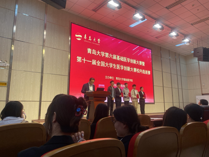 stage with a large screen displaying the words "Qingdao University" and "Eleventh National Undergraduate Medical Innovation Competition