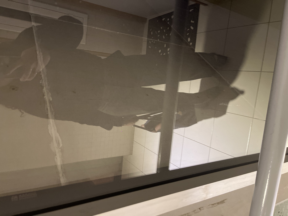 The image displays a self-portrait reflection of an individual standing indoors. The person is observed wearing a dark jacket or top and light-colored pants. A dark handbag is held in the subject's right hand, while a mobile phone, used to capture the image, is held in the left hand. The reflective surface, likely a mirror or glass panel, exhibits prominent horizontal white smudges and minor scratches across its central and upper-central areas. The floor is composed of light-toned square tiles with visible grout lines. A dark mat with scattered light speckles is present on the tiled floor to the right of the reflected figure. A plain, light-colored wall serves as the background. A white railing is partially visible in the lower foreground. The scene is illuminated by moderate artificial lighting. The specific location within Mexico City, Mexico, is not discernible from the visual evidence provided.