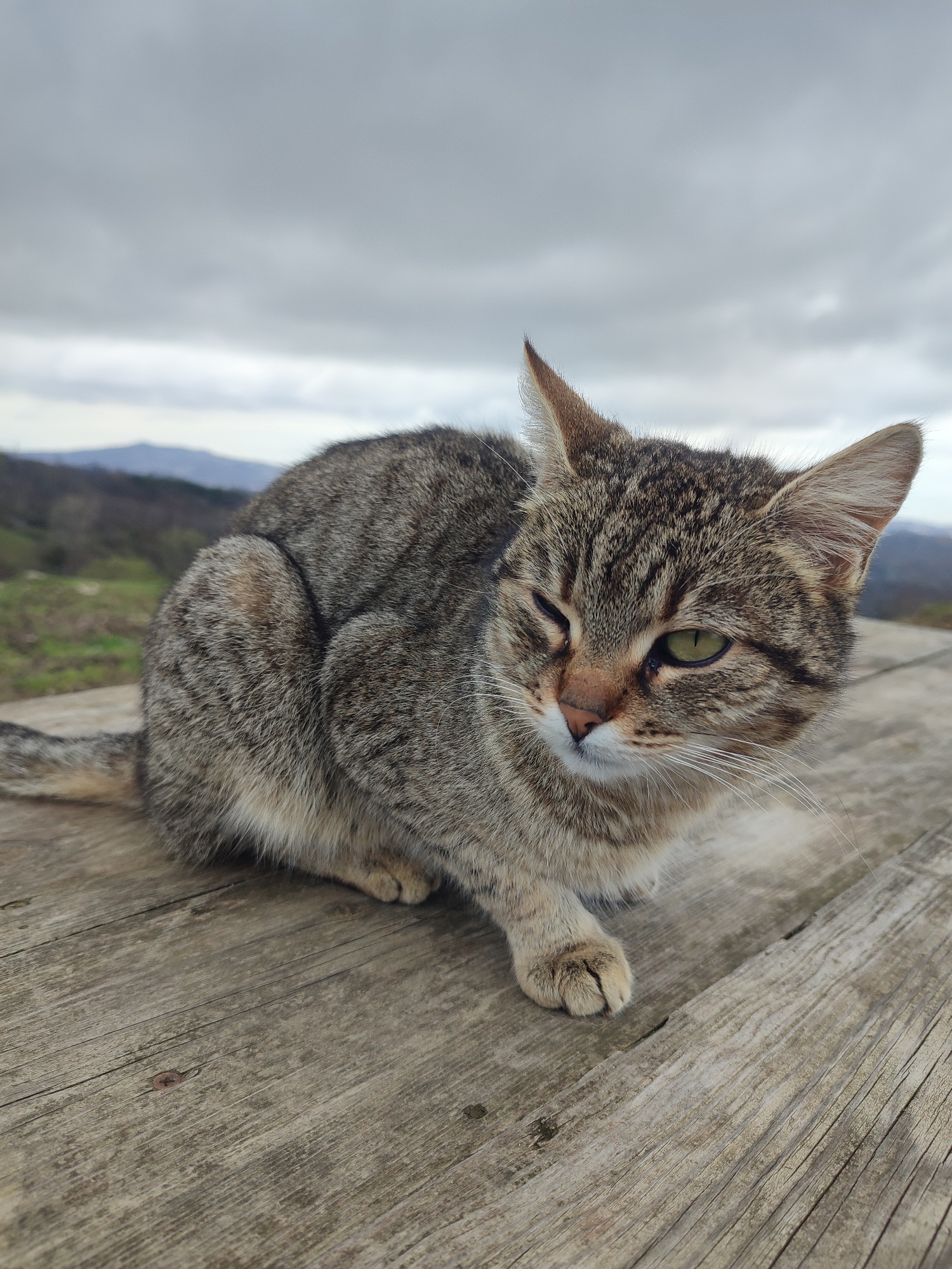 - "A domestic tabby cat is observed sitting on a weathered, light-grey wooden surface with prominent grain, located outdoors in Bestuzhevskoye, Russia" by FM-sFCoH2, licensed under CC BY 4.0