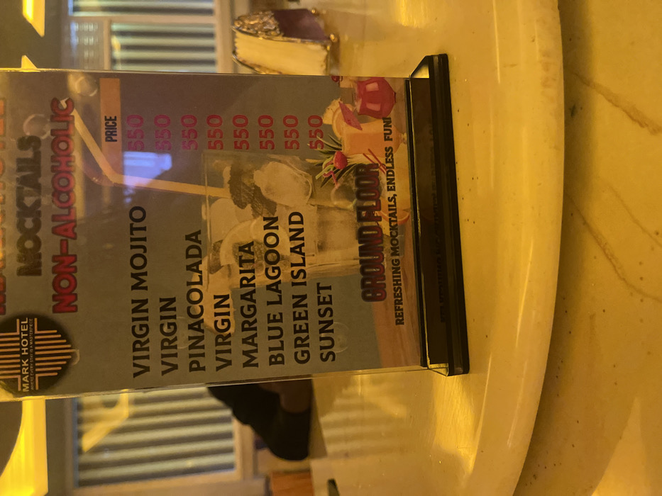 A transparent acrylic table-top menu stand is positioned on a glossy, reflective yellow surface, likely a table or counter. The menu displays the "MARK HOTEL" logo at the top left and features "MOCKTAILS NON-ALCOHOLIC" as a heading. A list of items includes "VIRGIN MOJITO," "VIRGIN," "PINACOLADA," "VIRGIN," "MARGARITA," "BLUE LAGOON," "GREEN ISLAND," and "SUNSET," each priced at "550." Below the list, text reads "GROUND FLOOR" and "REFRESHING MOCKTAILS, ENDLESS FUN!" with an associated graphic of various mocktails. In the blurred background, the upper back and head of an individual wearing dark attire are partially visible to the left. Vertical window blinds are present behind the individual, illuminated by a warm light source. A decorative object, appearing to be a geode or crystal with a metallic gold base, is partially visible on the right side of the background. The environment is an interior space, located in Gatongora ward, Kenya.