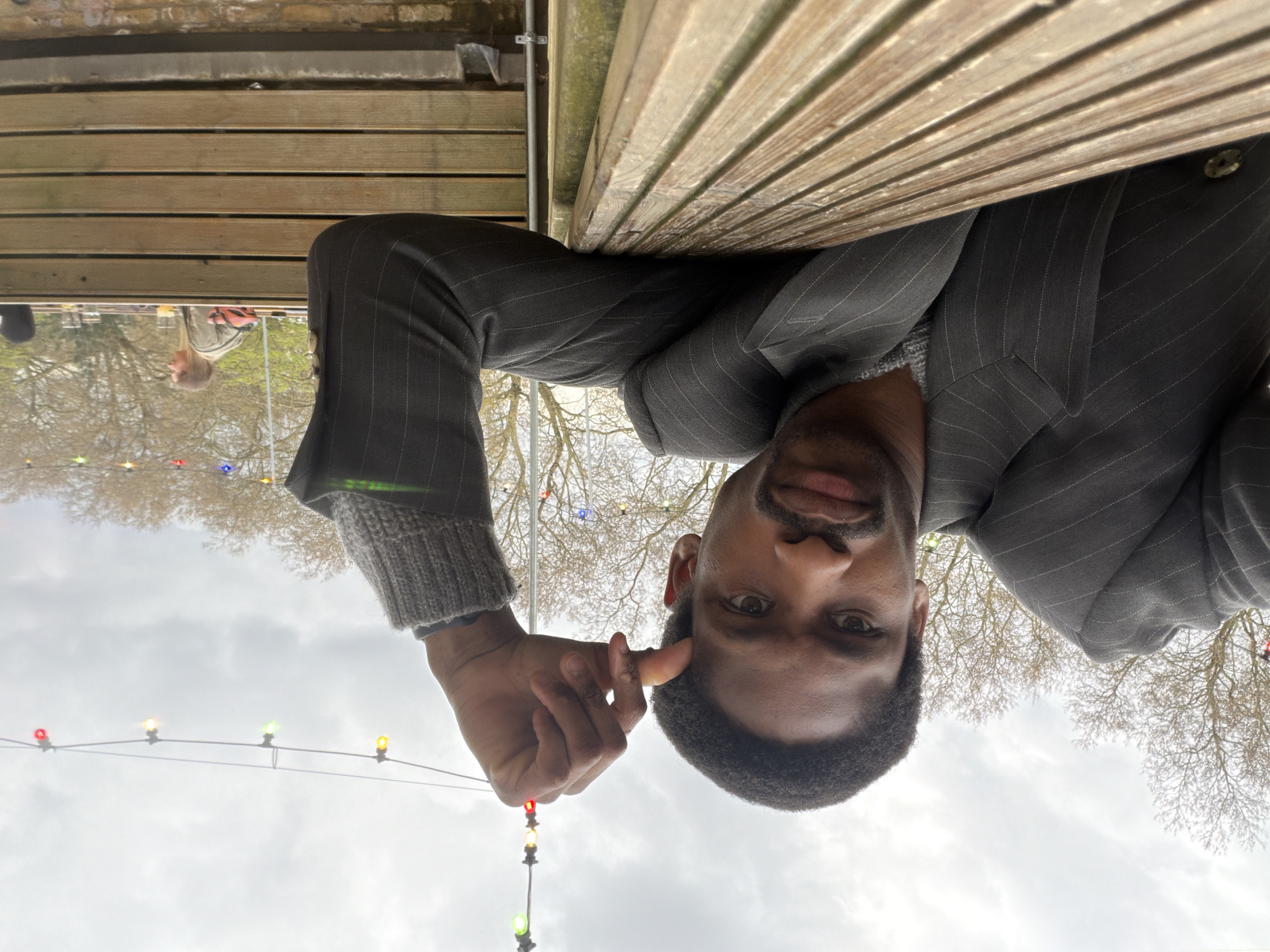 A man with dark skin and short, dark hair is facing the camera. He is wearing a pinstripe suit jacket over a gray sweater. His right hand is raised, with his fingers touching his ear. The background is a cloudy sky with bare tree branches and a string of colored lights hanging below. Above the man is a wooden structure. The location appears to be an outdoor setting in the city of London, United Kingdom. Other people are faintly visible in the background.