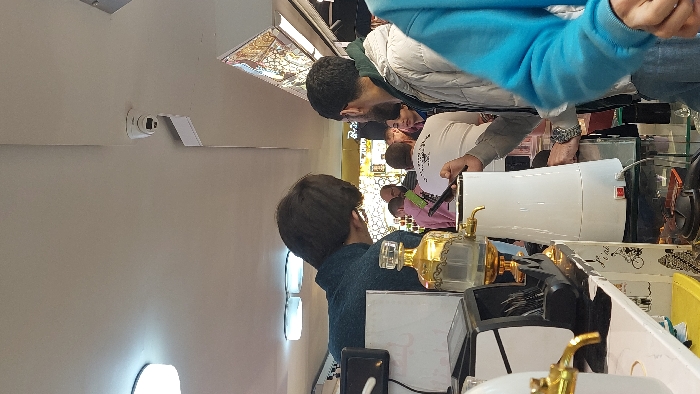 Inside a retail setting, customers stand near a counter displaying perfumes