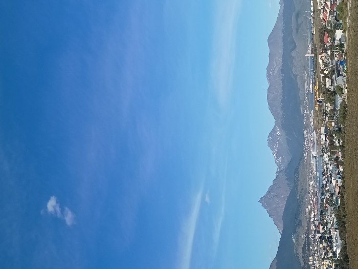 A scenic vista features a clear, expansive blue sky, punctuated by a small, fluffy cloud. Mountains rise on the right side of the image, their slopes partially covered in verdant vegetation and patches of snow. A densely populated town sprawls at the base of the mountains, its buildings interspersed with trees. A strip of brown land borders the town.