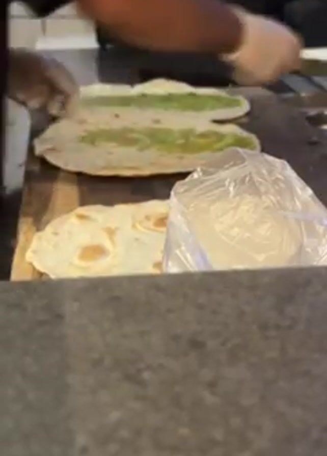 A close up shot shows a worker’s hands wearing white gloves preparing flatbreads. The flatbreads are arranged in a row on a dark surface. Two of the flatbreads have a green substance spread on them. Next to the last flatbread is a plastic bag. The worker spreads the green substance on the last flatbread. In the background is a tile wall, a point of sale system, and other kitchen equipment.