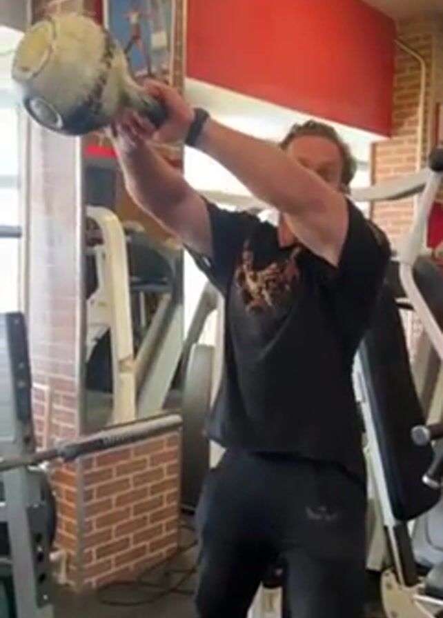 A man is lifting a kettlebell in a gym. He is wearing a black t-shirt and pants. The kettlebell is silver and has a rusty appearance. He swings it from side to side while holding it with both hands. The gym has brick walls and various workout machines in the background. The man smiles at the camera while exercising.