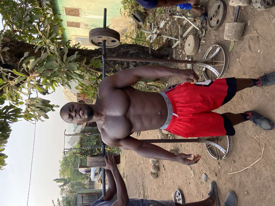 A muscular man is the focus, shirtless and wearing red shorts with black trim. He stands outdoors, with a weightlifting setup involving wheels and concrete weights behind him. Another individual is partially visible, possibly spotting or assisting him with the weights. A tree with broad leaves is to the left. The background appears to be a residential area with houses.