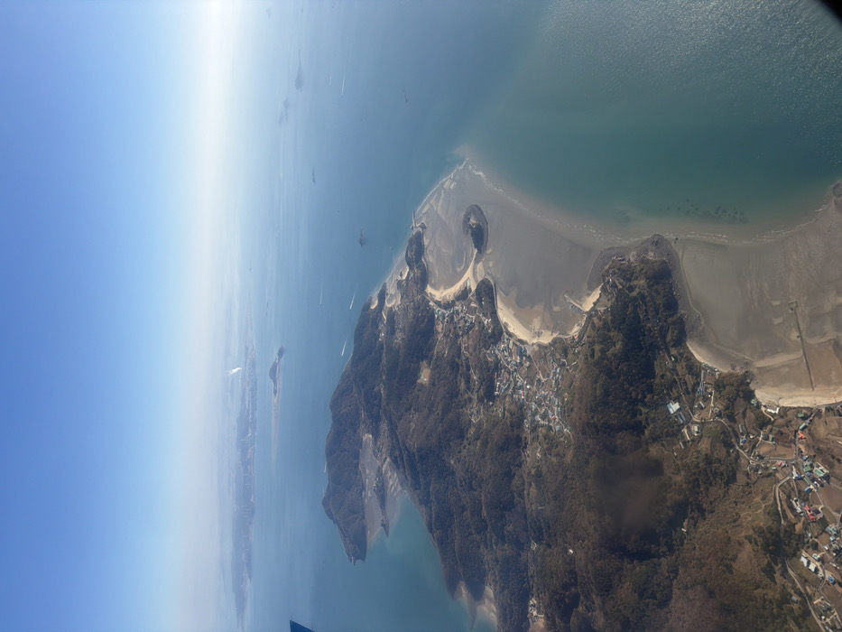 An aerial view shows a land formation jutting into a body of water. Several small landmasses lie parallel in the distance. The shoreline is marked by beach and evidence of low tide exposing sand flats. A small town occupies the terrain near the shore. The land is forested with some bare patches. The sky is clear and blue, hazy near the horizon.