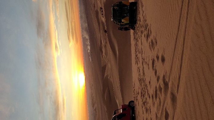 The scene depicts a desert landscape at either sunrise or sunset, located in the vicinity of Ica, Peru