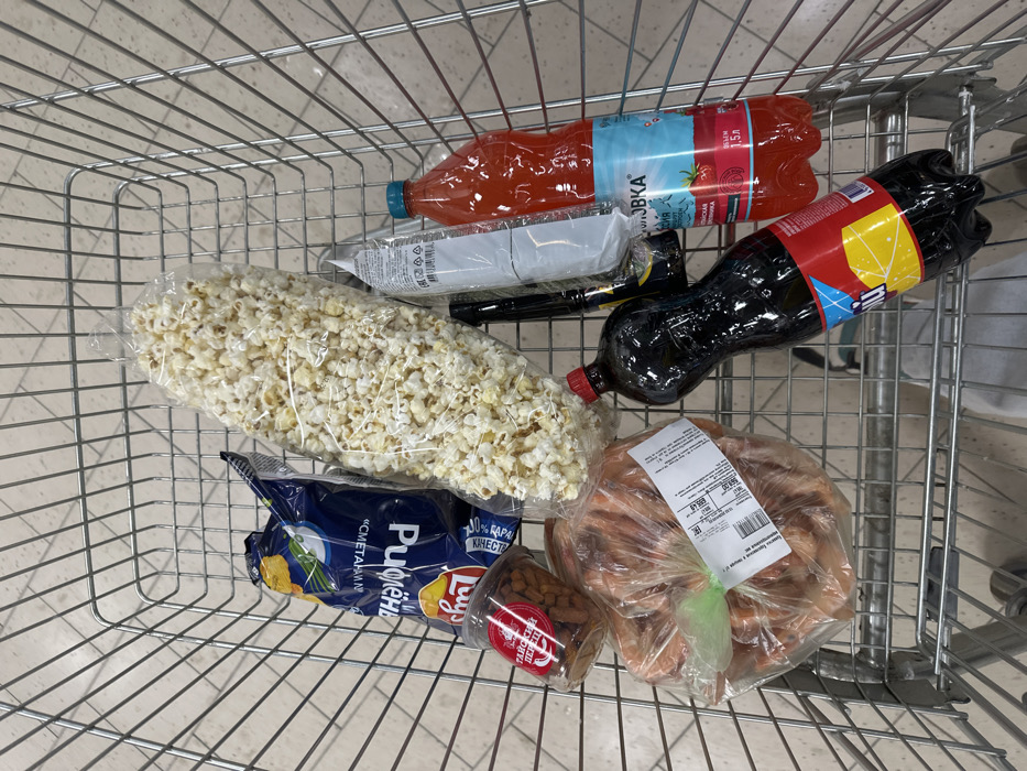 A shopping cart contains various items. There is a bag of popcorn, Lay's sour cream-flavored chips, a container of small sweets, a large bag of frozen shrimp, a white package (possibly cheese), a bottle of strawberry juice, and a bottle of dark soda. The items are casually arranged in the metal shopping cart, filling the space.