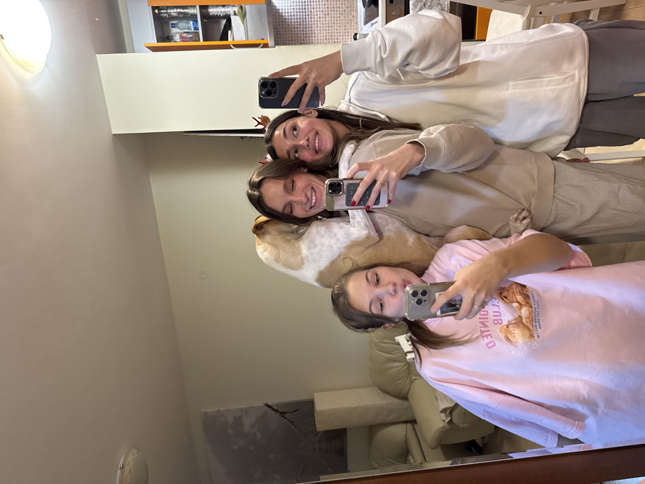 Three girls are taking a mirror selfie. The girl at the top wears reindeer antlers and a cream-colored sweatshirt. The middle girl has on a light brown hoodie. A dog's head is visible next to her. The bottom girl is wearing a pink t-shirt with a dog graphic. All three girls are holding phones and smiling. The mirror reflects a room with a light fixture, artwork, and a chair. The background shows a kitchen cabinet and tile.