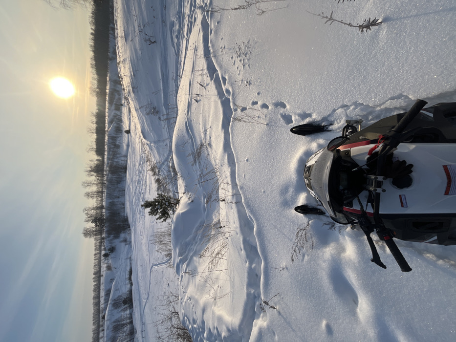 The image depicts a snow-covered, rural landscape in Новочувашский, Russia, under a clear, sunny sky. In the immediate foreground, a white, black, and red snowmobile is parked on a snowy incline, viewed from a slightly elevated perspective. Its handlebars, dashboard, and the front portion of its body are visible, with a black glove resting on the left handlebar. The snow around the vehicle is deep and undisturbed, except for some sparse dry vegetation protruding. Beyond the snowmobile, the terrain descends into a wide, snow-filled valley or ravine featuring rolling hills and depressions. Snowmobile tracks are discernible in various patterns across the valley floor. A single small, dark green evergreen tree stands centrally within this lower area. Further on the right, distinct animal tracks are pressed into the snow. The distant horizon is marked by a dense line of bare deciduous trees and scattered evergreens. The sun, bright and low in the sky, is positioned towards the upper right, casting strong light and creating a prominent glare on the pristine snow. The sky above is a pale, clear blue. No people are visible.