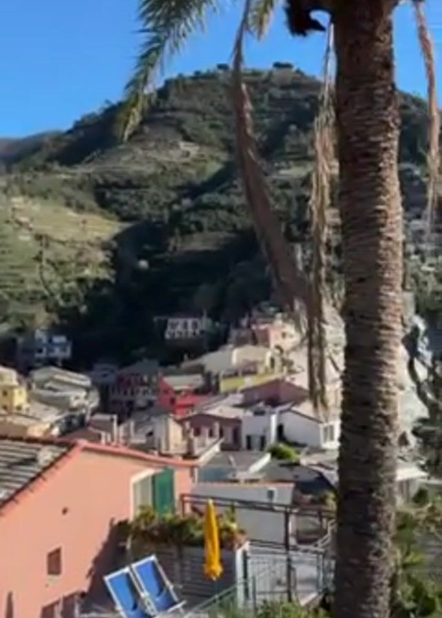 The video showcases a picturesque view of Vernazza, a village in Cinque Terre, Italy, on a bright, sunny day. The camera slowly pans from the colorful rooftops of the town towards the coastline, revealing the bright blue sea. A palm tree stands prominently in the foreground, partially obscuring the view but also adding a tropical touch to the scene. Terraced hills rise in the background. A flag, likely representing the European Union with a green stripe added, flaps gently in the breeze next to the sea. The video captures the serene and scenic beauty of this coastal Italian village.
