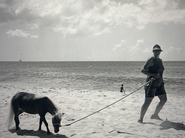 - "A monochrome beach scene features a woman walking a pony on a leash" by FM-yiJzw1, licensed under CC BY 4.0