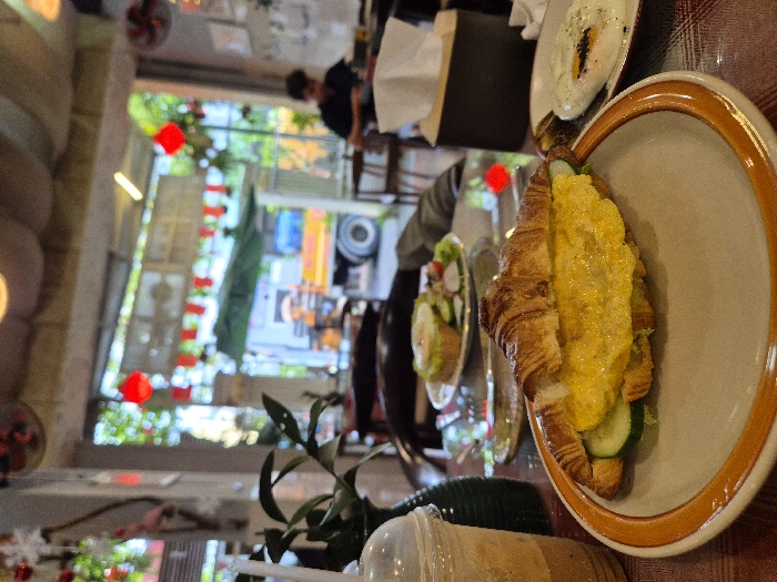 A croissant sandwich fills a plate with an orange rim. The croissant is filled with a yellow topping, lettuce, and sliced cucumbers. A salad in a glass bowl is in the background. A person is out of focus in the background, and there are red decorations hanging from the ceiling near a window.