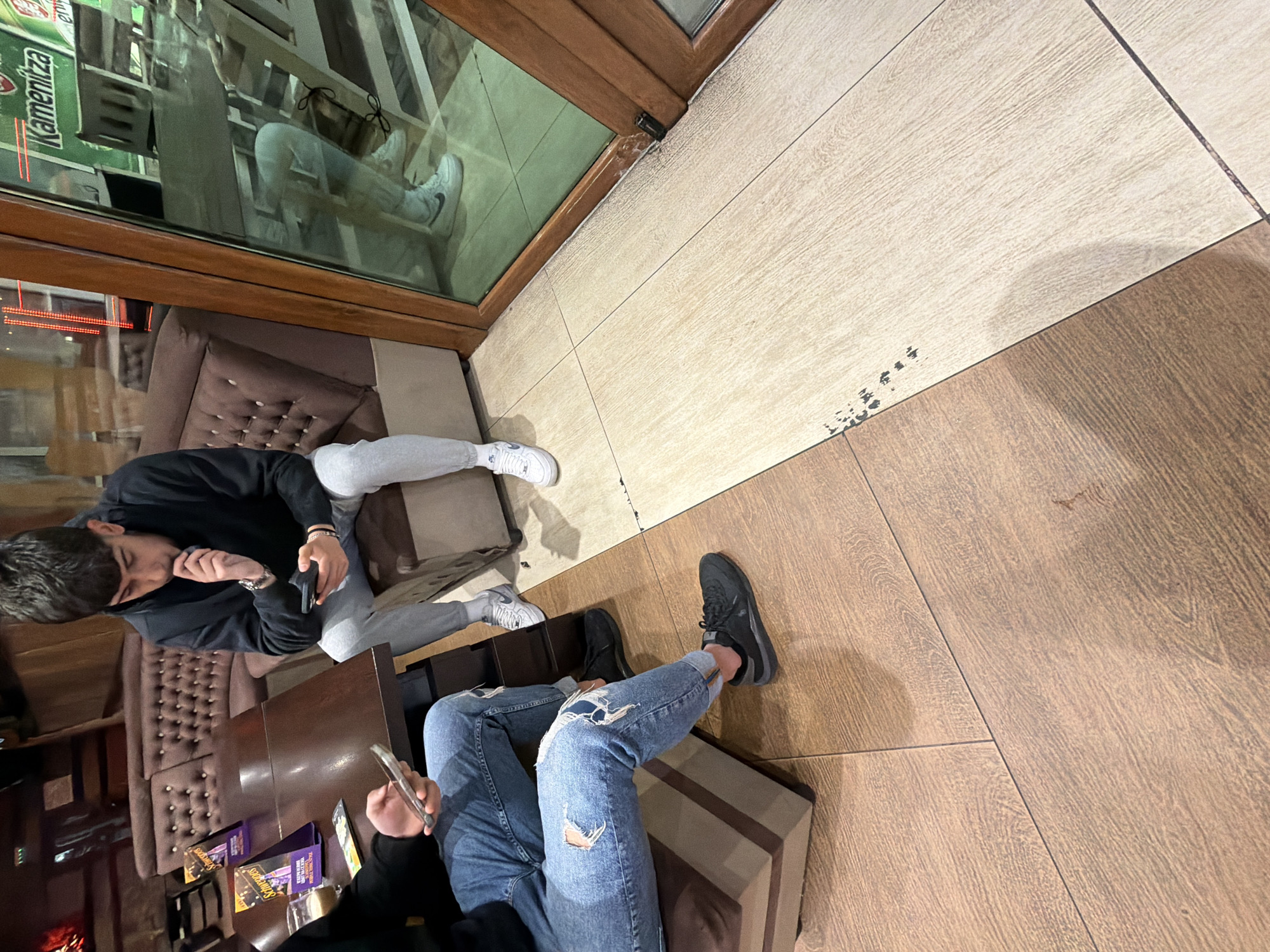 Two individuals are seated at a table in what appears to be an indoor cafe or lounge. One person, wearing a black hoodie and grey sweatpants, is seated on a brown upholstered sofa and holds a mobile phone. Their left hand is positioned near their face. The other individual, clad in ripped blue jeans and a dark jacket, is also seated on a sofa, holding a phone. In front of them on the table are two menus with visible titles. The cafe has wood-look flooring, and there is a glass partition with an advertisement or sign visible behind the seating area. Based on the location in the city of Madan, Bulgaria, this could be a local cafe or pub.