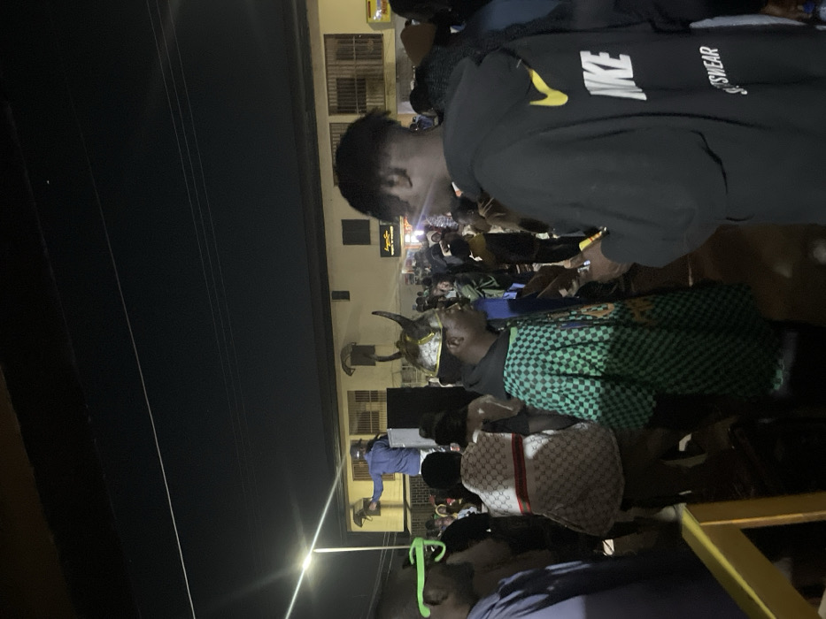 A crowd of people is gathered at night. One individual wears a horned mask and green checkered shirt. A person in a black Nike hoodie stands nearby, looking down. Another person carries a cream and brown bag. A building is visible in the background with a few lit windows. Power lines extend across the top left of the frame. The scene appears to be a street gathering or event.