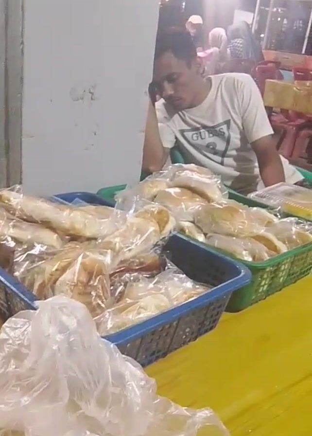 A man in a white t-shirt with a GUESS logo sits at a yellow table, resting his head on his left hand. He appears tired or bored. In front of him are two plastic baskets, one blue and one green, filled with individually wrapped bread-like items. A clear plastic bag sits to the left of the blue basket. The background is blurry, but suggests an outdoor or semi-outdoor setting, possibly a market. There is a white pillar to the man's left and hints of people and seating in the distance.