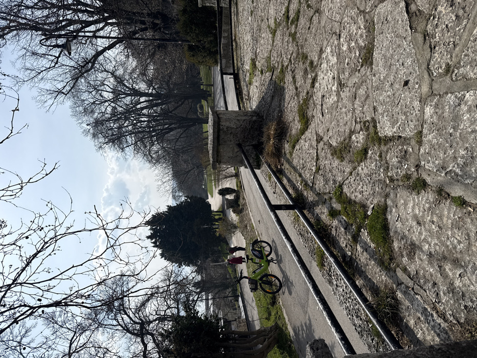The image depicts a scene within the Sea Garden in Varna, Bulgaria, on a clear to partly cloudy day. The foreground on the right consists of an uneven, light-colored stone slab pathway with grass and small plants growing between the cracks. A weathered, dark metal railing runs diagonally across the mid-ground, extending from the bottom-left toward a rough-hewn square stone pillar on the mid-right, separating the upper stone path from a lower asphalt pathway. On the asphalt pathway, a lime-green shared bicycle with a front basket is parked upright, oriented towards the right. Further down this path, two individuals are visible. One person wears a distinctive red coat, while the second individual wears darker clothing; both are partially obscured and facing away from the viewer, appearing to be stationary or walking slowly. The background is dominated by numerous deciduous trees with bare branches, suggesting late winter or early spring. A dense, dark evergreen tree stands prominently in the center-left. Distant features include a body of water, consistent with the Black Sea, visible on the left horizon. An ornate, dark-colored streetlamp stands on the far right, partially obscured by tree branches. The sky is bright blue with scattered white cumulus clouds, and strong sunlight casts distinct shadows across the scene.