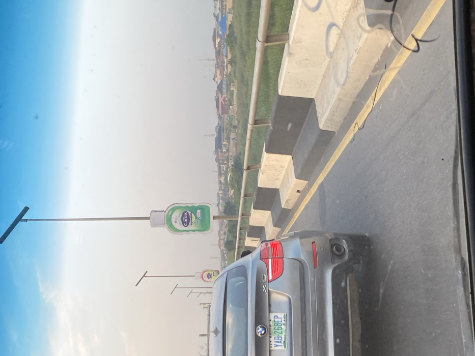 On a bridge with alternating black and white barriers, a grey BMW X5 travels on the road. A yellow line separates the traffic lanes. Advertisements for Carex hand sanitizer are positioned on poles along the roadside. The license plate reads “YAB-268EP”, and identifies the car as registered in Abuja. A faint cityscape stretches along the horizon under a hazy sky. Part of the window’s frame and some reflections are visible in the foreground.