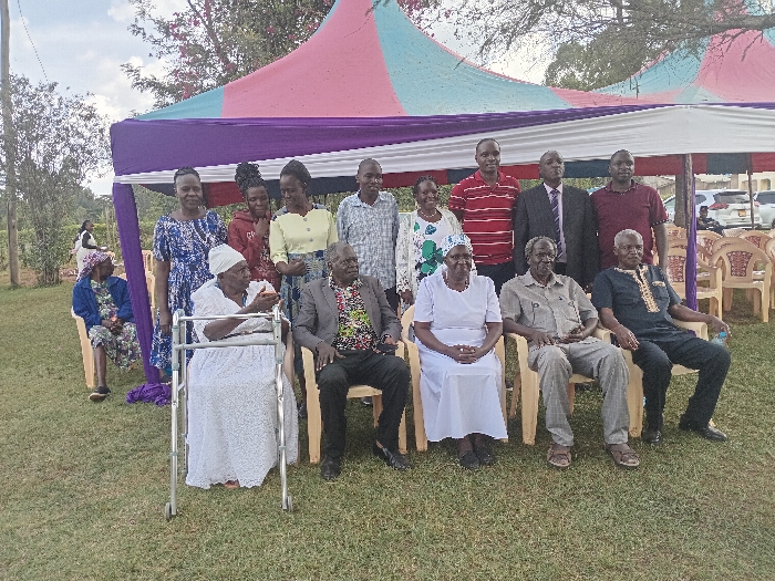 The scene depicts an outdoor gathering of 15 individuals in Ngenyilel ward, Kenya. The setting is a grassy lawn under an overcast sky. A large, multi-colored canopy, featuring segments of pink, light blue, purple, and white fabric, covers the main group. In the foreground, five elderly individuals are seated on light-colored plastic chairs. From left to right within this row: an elderly woman in a white dress and headwrap, positioned next to a silver wheeled walker; an elderly man in a dark suit jacket and colorful patterned shirt; an elderly woman in a white dress and headwrap, hands clasped in her lap; an elderly man in a light-colored button-up shirt and trousers, wearing sandals; and an elderly man in a dark patterned tunic and trousers, holding a blue plastic bottle. Behind this seated row, eight adults are standing under the canopy. These include, from left to right: a woman in a blue patterned dress; three younger women (one in a red hoodie, one in a light yellow top, one partially obscured); a man in a light patterned shirt; a man in a red striped polo shirt; a man in a dark suit, white shirt, and striped tie; and a man in a maroon polo shirt. Additionally, on the far left of the image, a woman in a blue jacket over a patterned dress is seated on a plastic chair. In the distant background on the far left, another woman in a white headscarf is partially visible, walking away. The right background contains numerous unoccupied light-colored plastic chairs and a light-colored SUV-type vehicle. Lush trees and dense foliage dominate the left and mid-ground background.