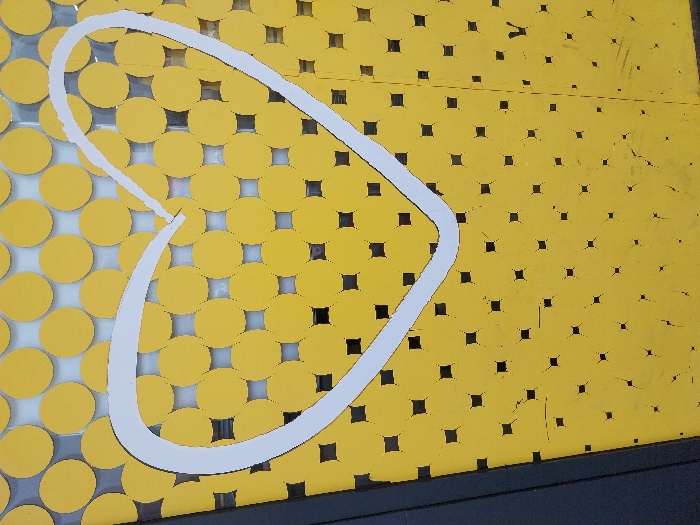 The image depicts a section of a vertical yellow panel or wall surface located in Stamboliyski, Bulgaria. The upper portion of this yellow surface is perforated with a repeating pattern of circular cut-outs, revealing a light-colored material or background behind them. Below this, the yellow surface transitions to a pattern of smaller, square perforations, through which a darker material or background is visible. A large, stylized white outline of a heart is prominently painted or affixed across the central and upper parts of the yellow panel, overlaying both the circular and square patterned sections. The lower left area of the yellow panel shows signs of wear, including multiple scratches and minor surface damage. A dark, vertical structural element, likely a frame or adjacent panel, is present along the extreme left edge of the composition. No individuals, explicit actions, or interactions are visible within the frame.