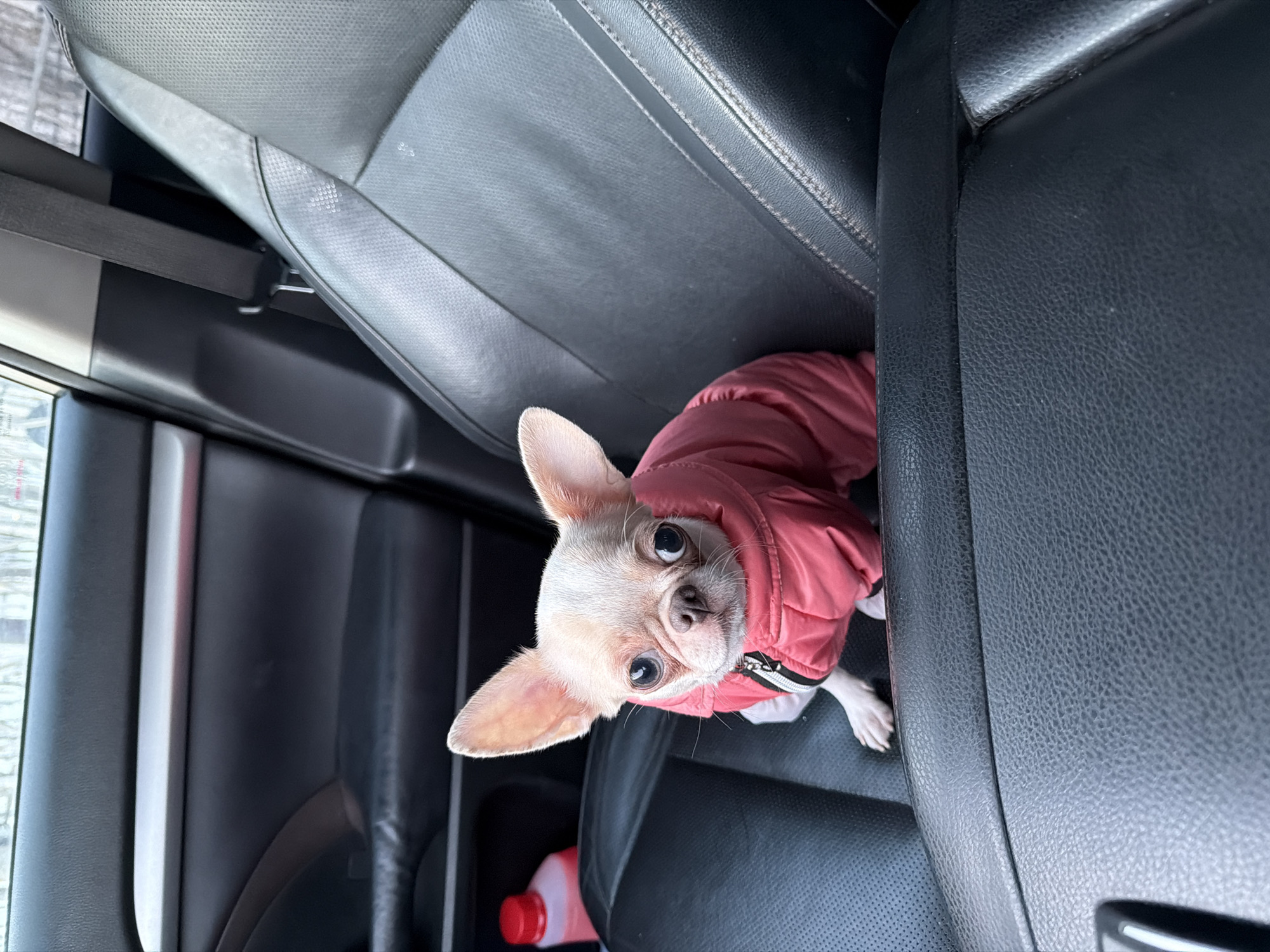 - "A light-colored Chihuahua wearing a pink jacket is in the back seat of a car" by FM-cxt8n2, licensed under CC BY 4.0