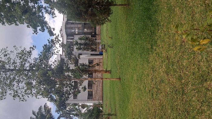 A multi-story institutional building, likely part of the University of Nairobi, Main Campus, is depicted under a partly cloudy sky. The building features a light grey facade with sections of horizontal brown brick or stone cladding on its lower levels. Rectangular windows with dark frames are visible across its expanse. A prominent section on the right side of the structure is characterized by extensive dark, reflective glass paneling, suggesting a modern architectural element or entrance. In the foreground and midground, a well-maintained green lawn occupies the majority of the frame, showing some areas of sparser or browner grass. Numerous trees are distributed across this lawn: a tall, mature tree with dense green foliage stands centrally, flanked by several younger, slender trees with lighter bark and less dense canopies. A partial view of a palm tree is visible on the far left. A small, leafy plant with yellow-tinged leaves is in the immediate lower right foreground. Near the base of the building, slightly right of center, a dark-colored outdoor bench is situated on the grass. To its left, a blue container or bin is partially visible adjacent to the building's facade. No individuals, activities, or interactions are visible within the scene. The overall environment appears calm and manicured, consistent with an educational or public park setting within the city of Nairobi, Kenya.