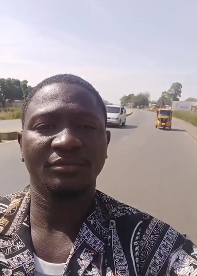 A man is taking a selfie-style video while on a motorcycle. He is wearing a patterned shirt and faces the camera with a neutral expression. The road stretches behind him with sparse traffic consisting of a white van, a car, and a yellow auto-rickshaw in the distance. The weather appears sunny, and the sky is clear. Trees and buildings can be seen alongside the road. At the 0:00 mark, an explosion sounds briefly.